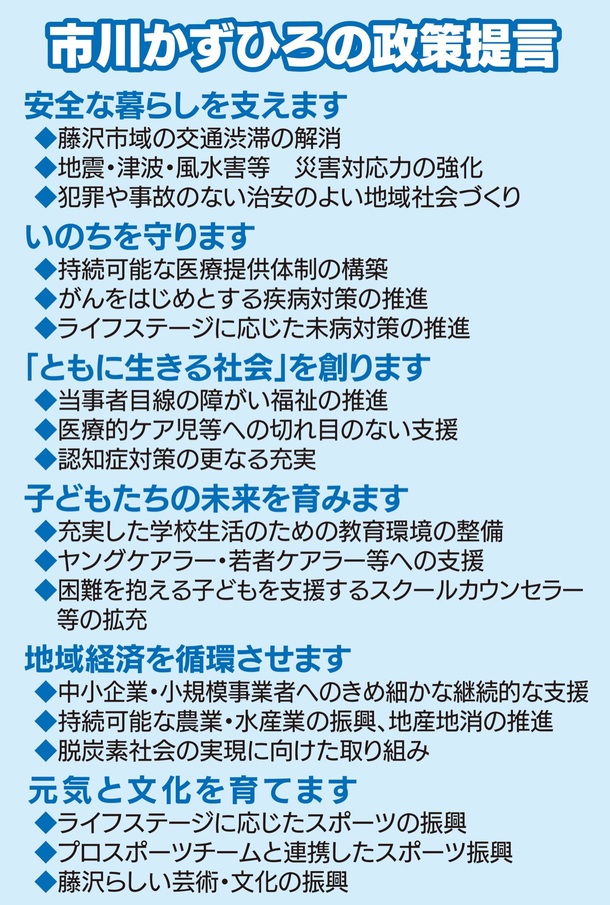 社会環境の変化が目まぐるしい時代であっても、誰もが自分の住み慣れたまちで、その人らしく暮らすことができる、働くことができる、学校に通うことのできるまちを創っていくことが、私の使命と考えております。そのために必要なことを左にまとめました。ご一読いただけたら幸いです。引き続き、政策を磨き、努力を重ね、藤沢の想いを神奈川へ届ける役割と責任を果たしてまいります。ご意見などお気軽にお寄せください。