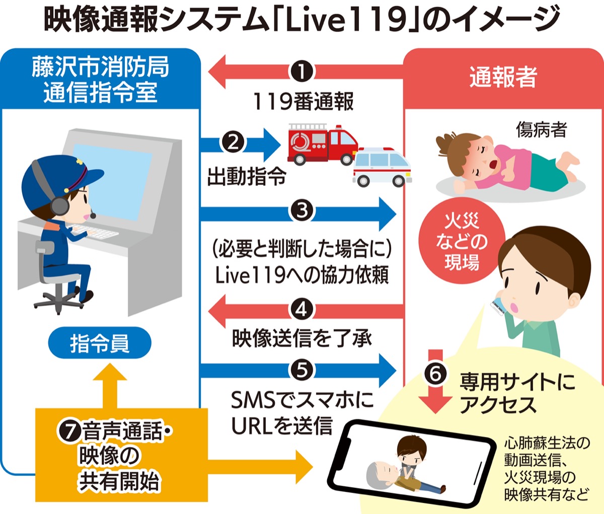 藤沢市消防局は4月1日、119番通報者とスマートフォンで映像のやり取りができる「Live119映像通報システム」の運用を開始する。隊員の到着前に傷病者や災害現場の状況の映像をリアルタイムで確認し応急措置の方法を映像で伝えたり、救助現場状況に応じて部隊を派遣するなど活用し迅速な消防救急活動につなげる。同様のシステム運用は県内で横浜市に次ぎ2例目。
