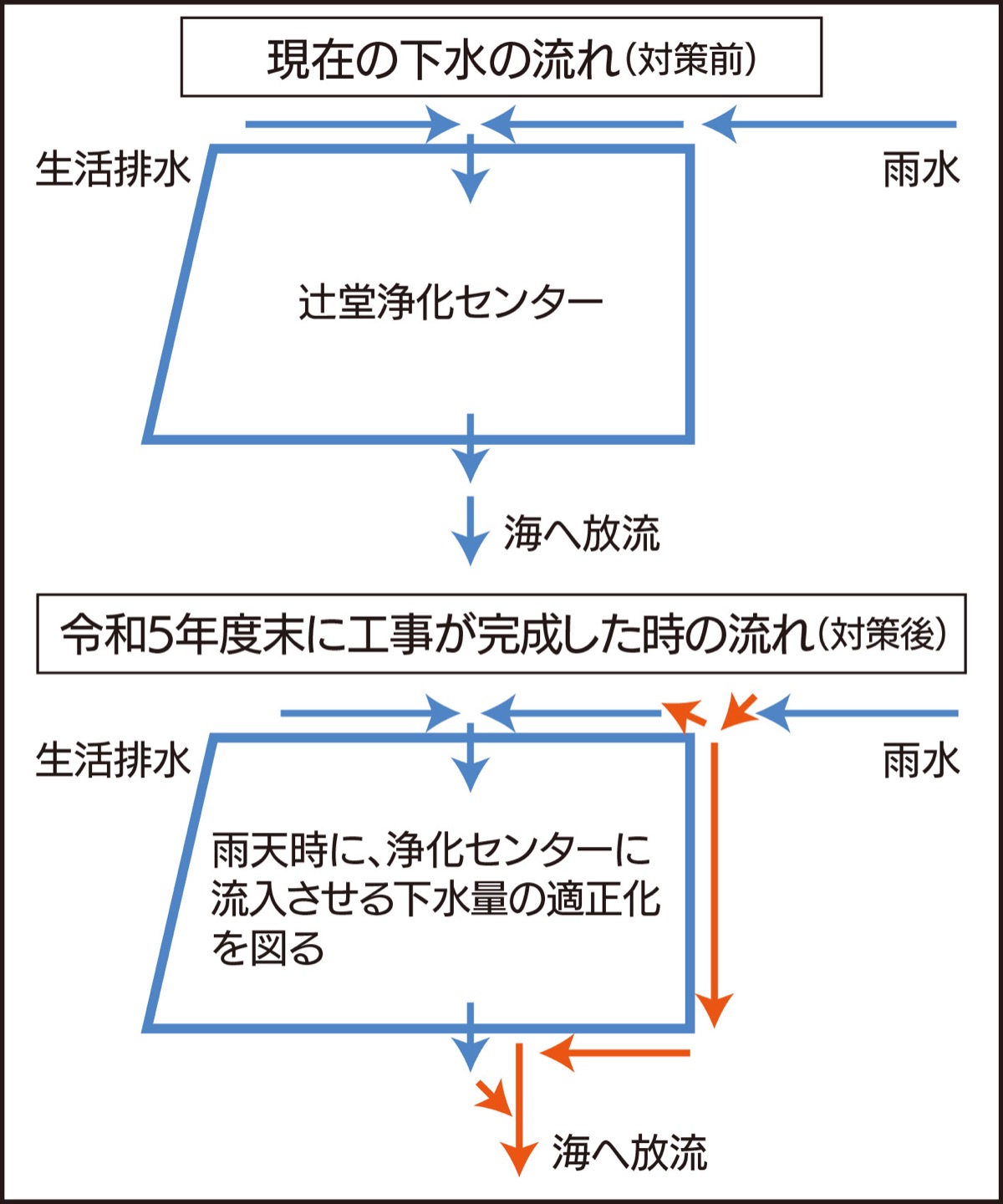 藤沢市南部の生活排水を処理する辻堂浄化センターは雨水と同時に処理する「合流式下水道」を採用しています。大量の雨水が浄化センターに流入すると生活排水と一緒になり、適正に処理ができなかった汚濁水が周辺の海に放流され水質悪化の原因となっていました。