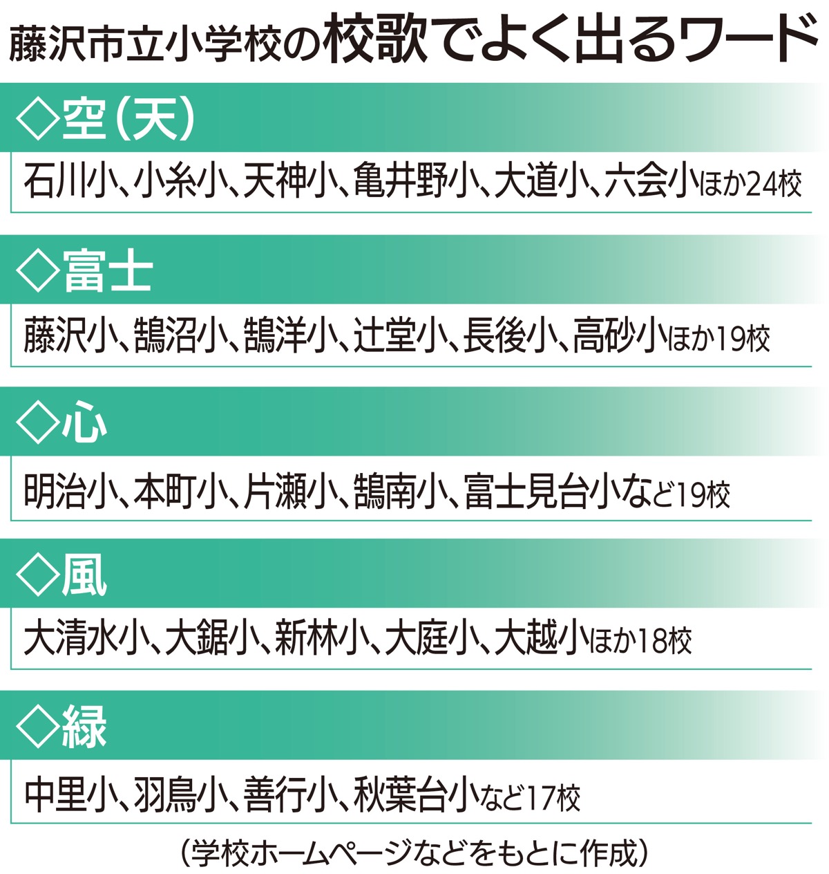 校歌で使われる歌詞に富士や空などが多いことについて、市教育指導課では「発達途上の児童でも共通認識の情景としてイメージしやすい。色々な節目で6年間歌うものなので、そうした言葉選びをしているのでは」と推測する。