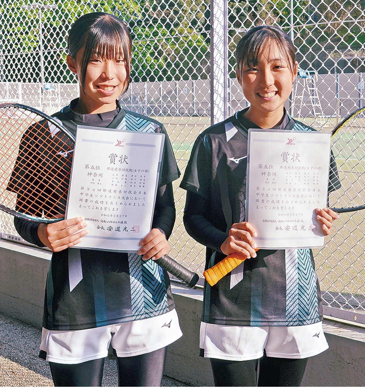 中学生ソフトテニスの大会「第34回都道府県対抗全日本中学生大会」が先月27日、28日に三重県で開かれ、神奈川県選抜チームが女子の部で5位入賞を果たした。8人の選抜メンバーに藤沢勢の六会中学校2年(大会時1年)鈴木綾華さん、湘南台中学校2年(同)市川結菜さんも選出され入賞の喜びをかみしめた。