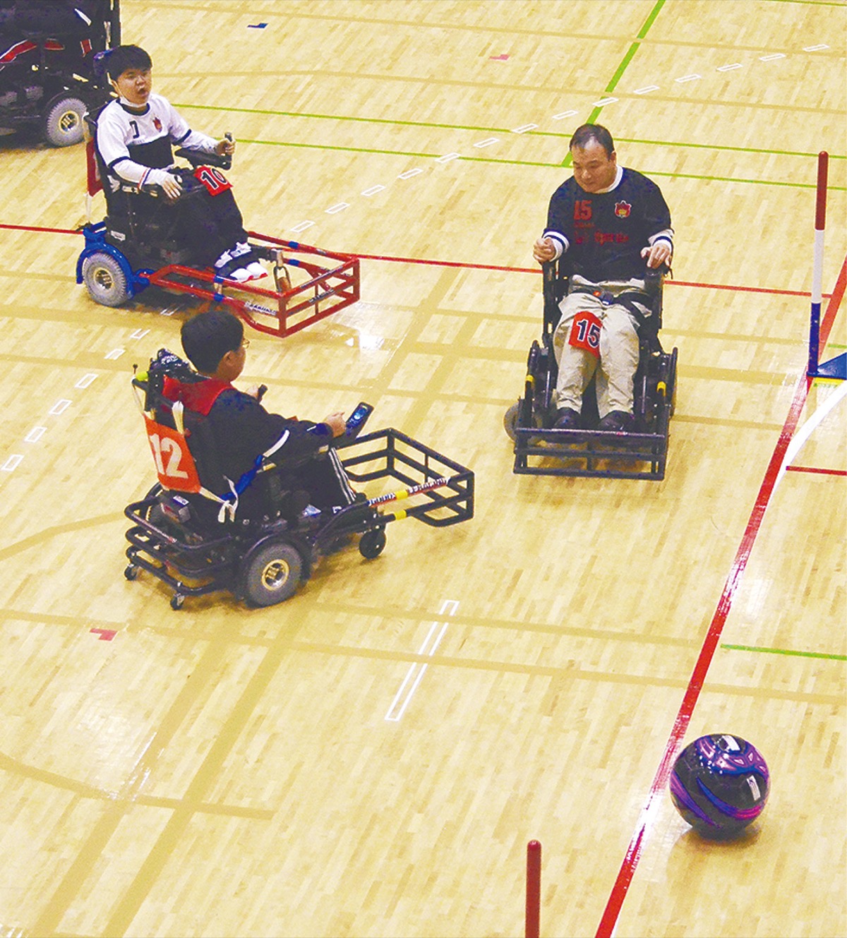 足元に金属製のガードを付けた競技用車いすを操り、直径32・5cmのボールをマシンで「蹴り」ながら相手ゴールまで運ぶ室内パラ競技。マシンをその場で回転させた勢いで放つシュートや、車いす同士を衝突させガードするなど、迫力満点のプレーが魅力の一つという。