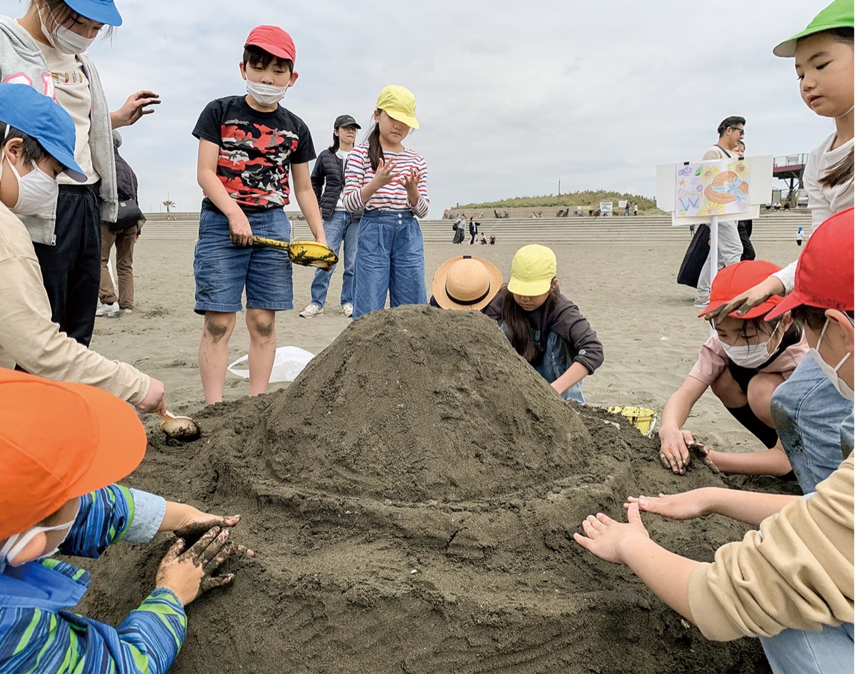 この日は、鵠沼松が岡にある学校から全校生徒が徒歩で海岸まで移動。18班に別れ、砂をスコップで掘ったり、バケツで海水を運んだり、役割分担をしながら作品を仕上げた。