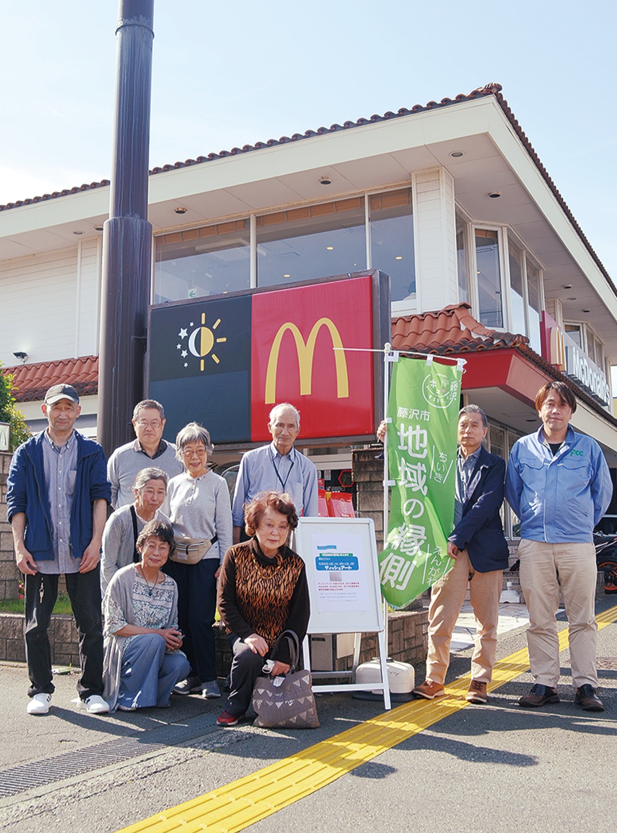 「みんな・de・六会」がスタートしたのは2016年。フランチャイジーとして同店を営む(株)グッドイーティング(藤沢)が市とマルチパートナーシップ協定を締結。地域貢献の一環として場所を提供し、社会福祉法人藤沢育成会が運営を担う。縁側の開催日は同法人の職員と地域のボランティアが常駐し、小物づくりや将棋など様々なプログラムを実施する。