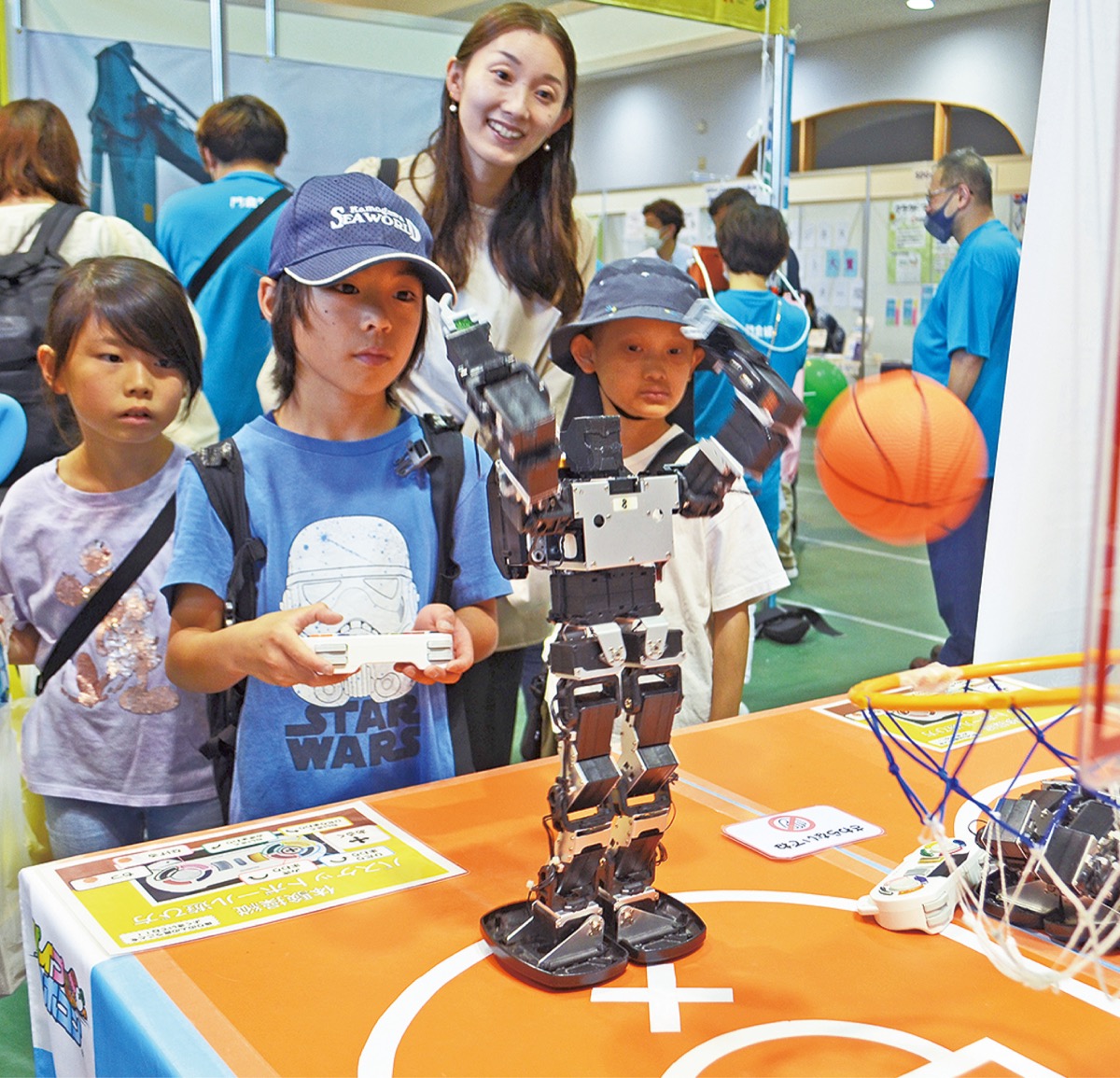 工業・情報のゾーンでは、地球と宇宙ステーションをつなぐ宇宙エレベータの模型やロボットの操縦体験など近未来の技術が盛りだくさん。ロボットで小型バスケットボールのシュートを体験した市内の男子小学生は「操縦は難しかったけど、動きが面白かった」と話した。