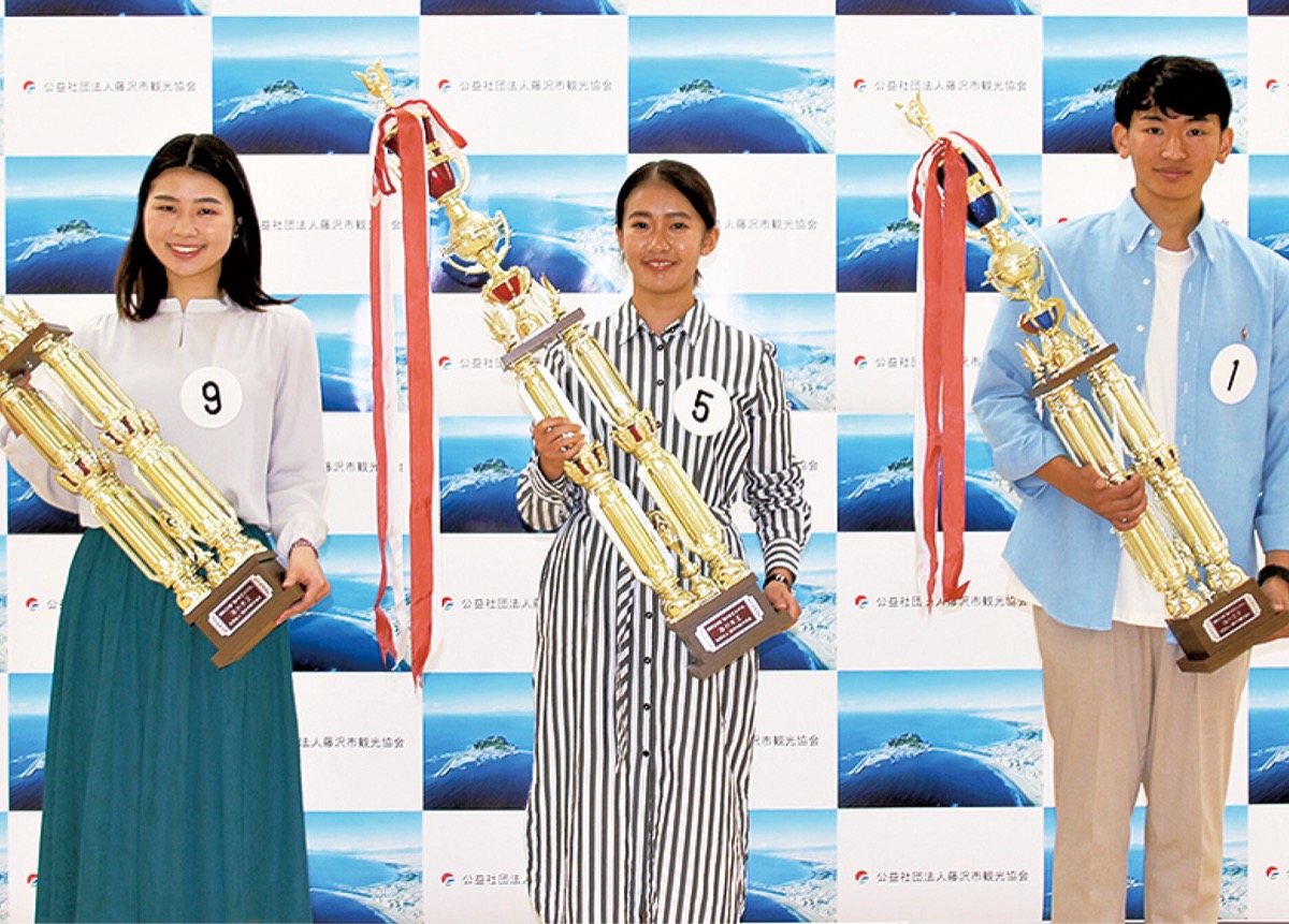 (公社)藤沢市観光協会が主催する「2023湘南江の島海の女王&海の王子コンテスト」が14日に開かれ、いずれも市内在住の加藤輝宇さん(19歳・大学2年)、小河阿弥さん(20歳・短大1年)、芳賀帆奈さん(22歳・大学4年)が選ばれた。
