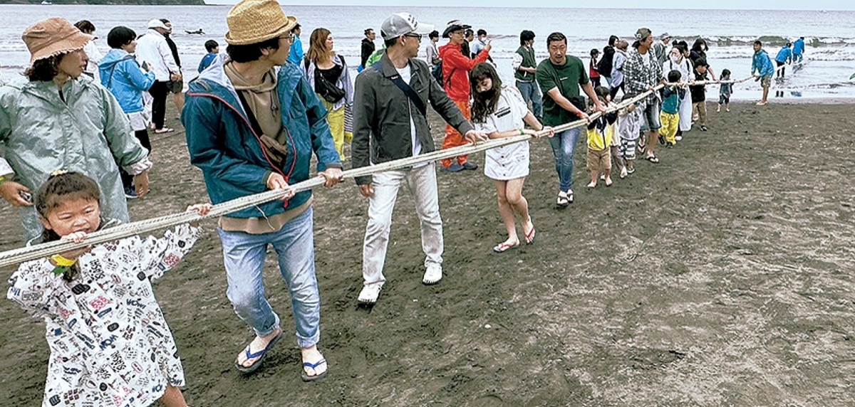 この日は、時折雨の降るあいにくの天候だったが、波は穏やかで、参加者は子どもから大人まで協力して綱を引いた。
