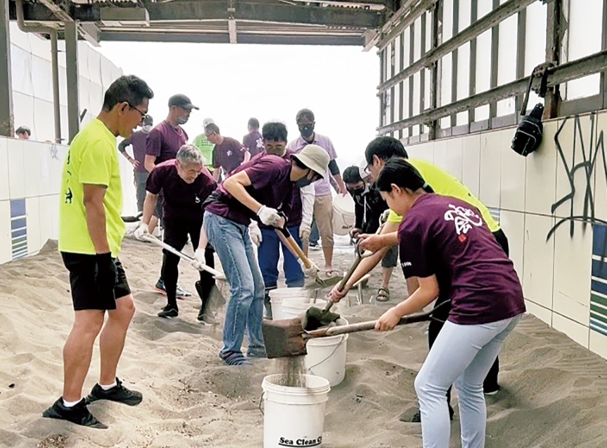 この日活動したのは、同会シークリーン倶楽部のメンバーなど約20人。地下道は市街地と砂浜をつないでおり、近隣住民やサーファーらが利用する。潮風の影響で路面が見えないほど砂が入り込み、「両脇には80cmほど積み上がる」という。