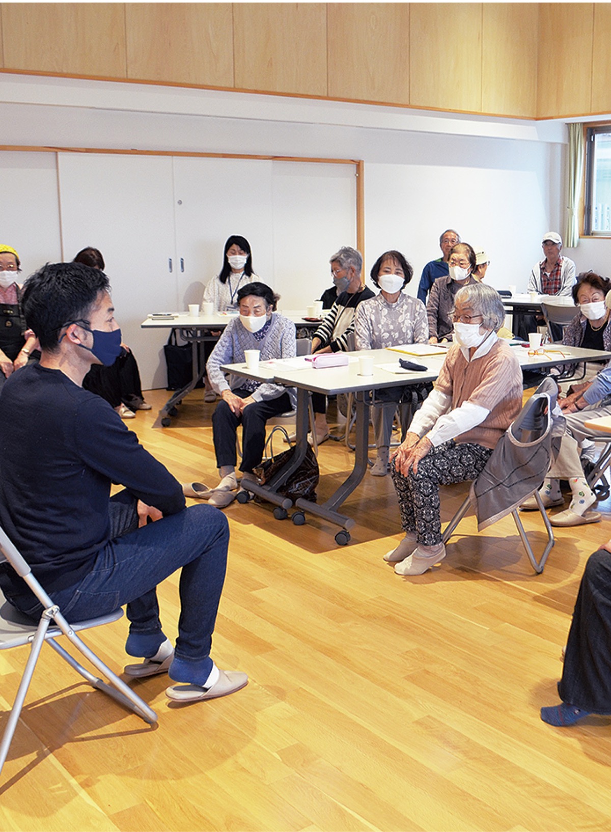 地域の縁側事業のなかでも高齢者を対象とした「特定型」のスタイルで、20日には健康体操や俳句の講座が行われていた。講師が座ってできる指や骨盤の体操を紹介し、「一日のうちで少しでもいいから、体を動かしましょう」と呼び掛けた。よく利用するという70代の女性は「毎月楽しみ。歌声喫茶が特に好き」とニコリ。会場での包丁研ぎも好評だ。