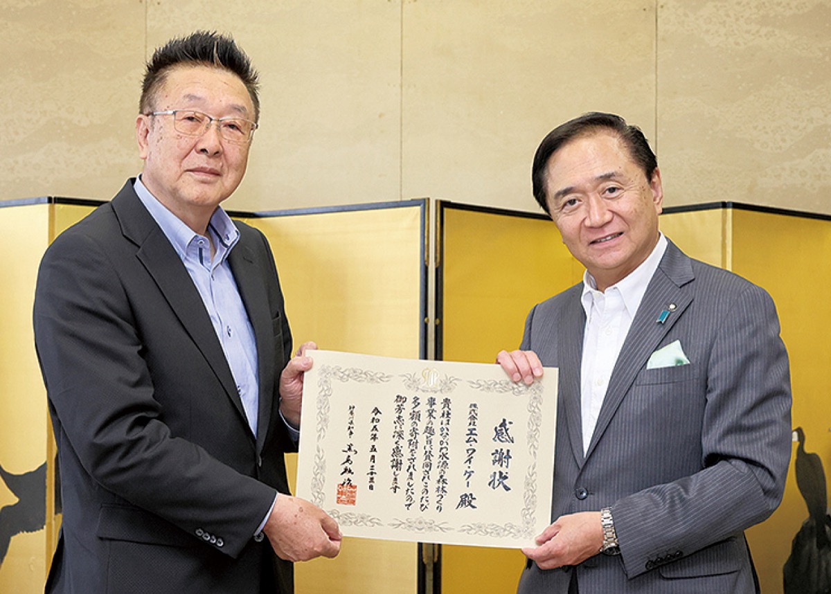 神奈川県内を中心に「美容室イレブンカット」を展開する(株)エム・ワイ・ケー(本社/藤沢市)に5月23日、県庁で黒岩祐治知事から寄付に対する感謝状が贈呈された。同社は昨年11月11日、県が良質な水の安定的確保を目的に行っているかながわ水源の森林づくり事業に、111万円を寄付した。