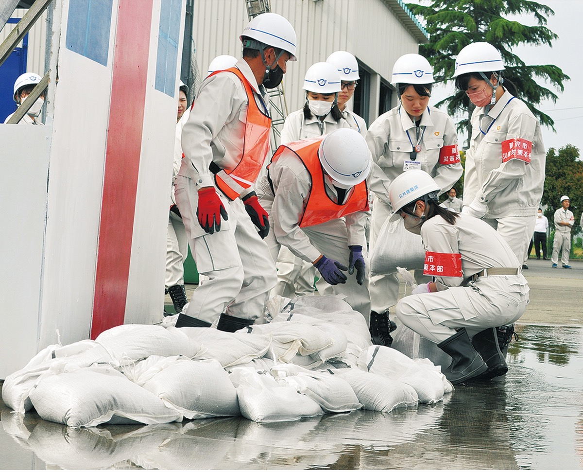 土のうを使った低地浸水防ぎょ訓練では、新採用職員らが班に分かれて袋に土を詰めて手早く約800個を作成。その後浸水した想定の場所に運び、積み上げ即席の堤防を築いた。