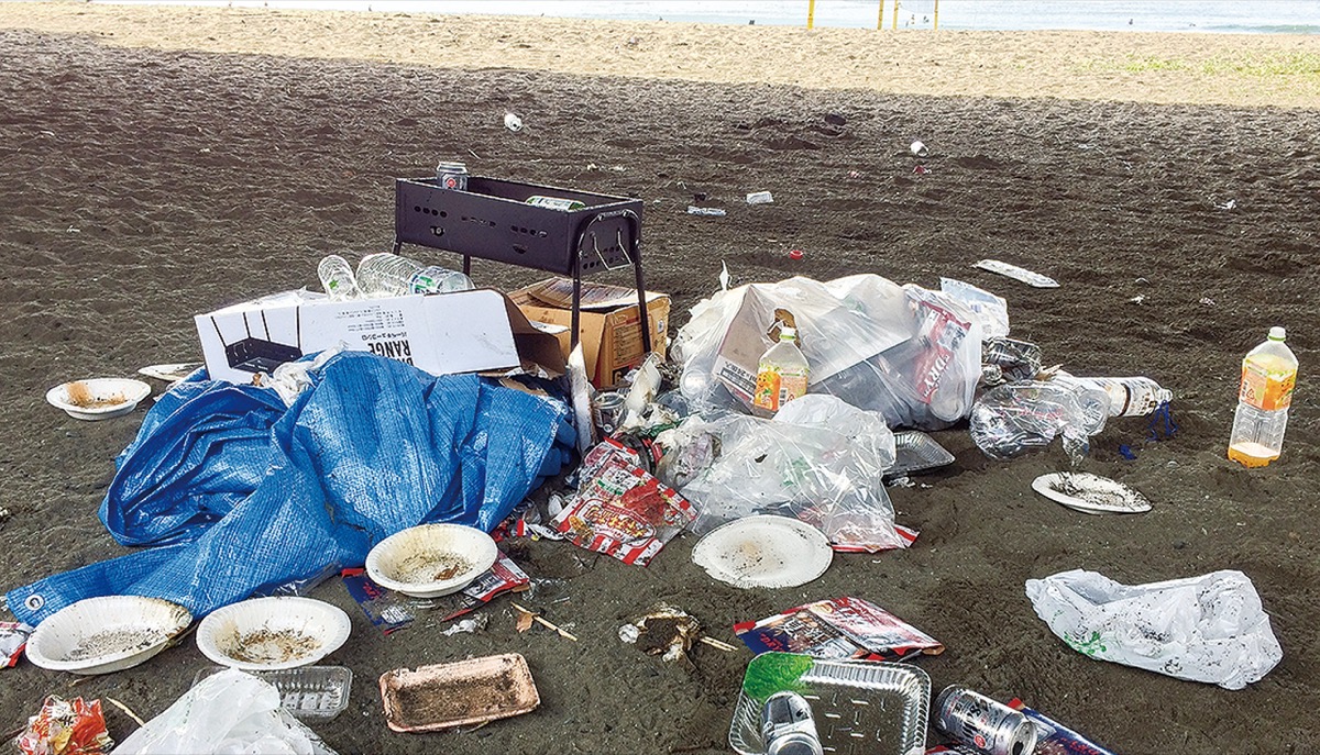海岸利用者が放置するごみは、地域にとって長年の課題だ。食材を放置するとカラスやトビが集まり、さらにごみを散乱させる。土に埋めても自然に分解されない炭を残して帰る人や、コンロなどの機材をそのまま捨てるケースもある。