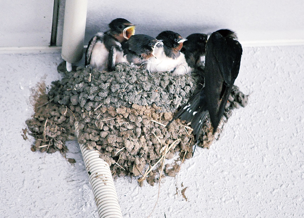 「ピーピー」。台風2号の接近に伴う荒天に見舞われた2日、親鳥が餌を運ぶとひなが元気な鳴き声をあげた。同署裏手にある駐車場の軒下には4つの巣があり、それぞれつがいが子育ての真っ最中だ。