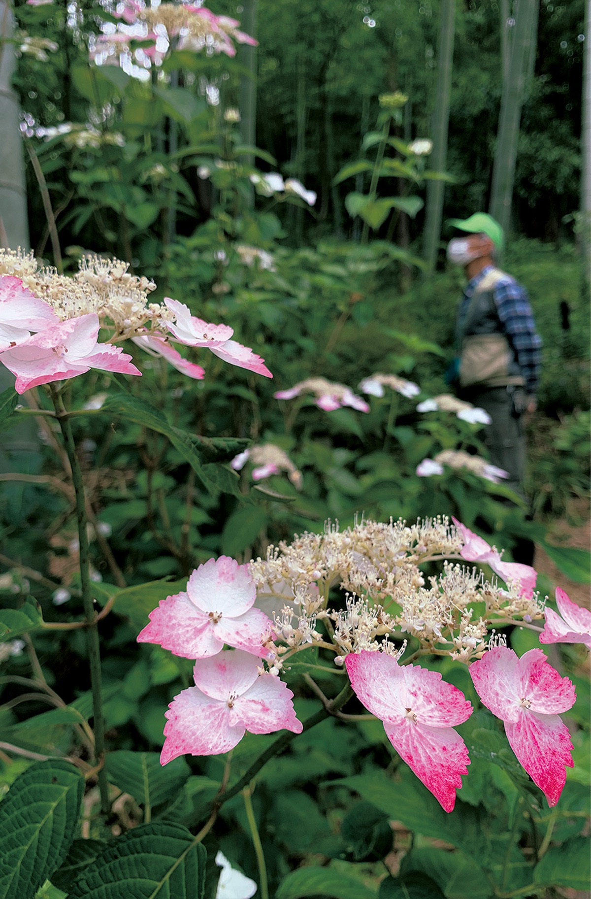 里山の自然景観の中でさまざまな山野草が鑑賞できる遠藤の「藤沢えびね・やまゆり園」でヤマアジサイが見頃を迎えた。淡いピンクやブルーが散策路を可憐に彩り、来園者の目を楽しませている。