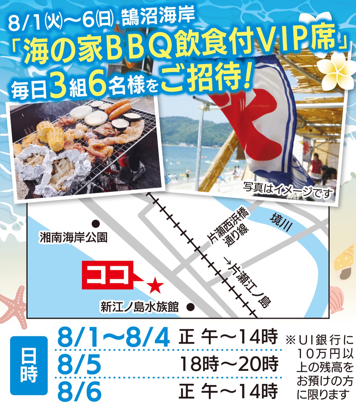 8月1日(火)から6日(日)まで、鵠沼海岸の海の家「海のリゾート」の飲食付VIP席(1人5500円相当)に毎日3組6名様を招待。オーシャンビューの海の家でボリューム満点のBBQなどの美味を堪能しては。詳細・申込は左記へ。