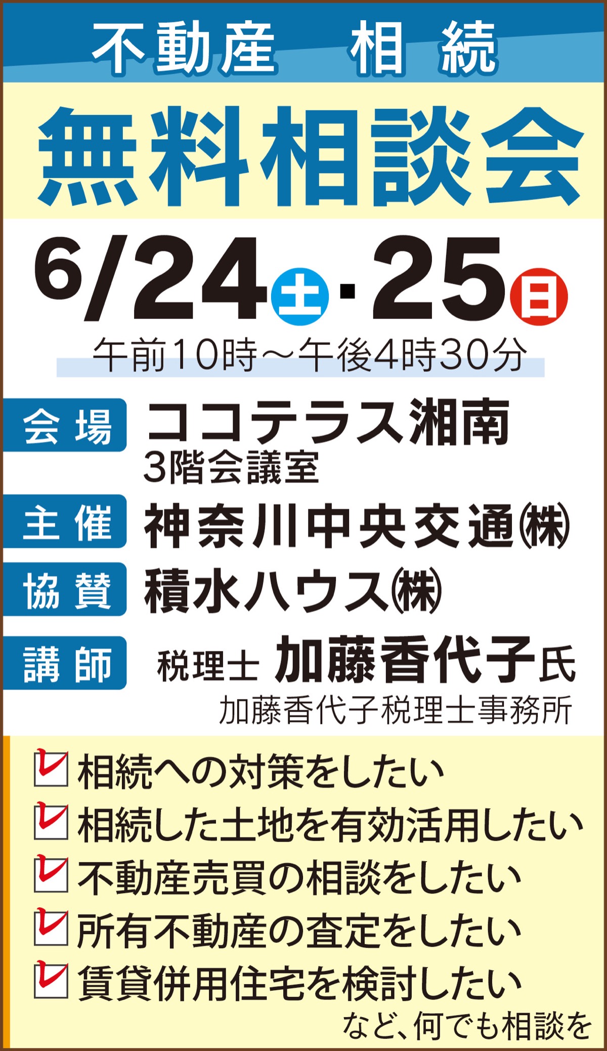 失敗しない不動産の相続・運用のために、税理士と宅地建物取引士が市民目線で親身に応じてくれる無料相談会が6月24日(土)と25日(日)、辻堂駅そばのココテラス湘南で開かれる。主催は神奈川中央交通(協賛/積水ハウス)。