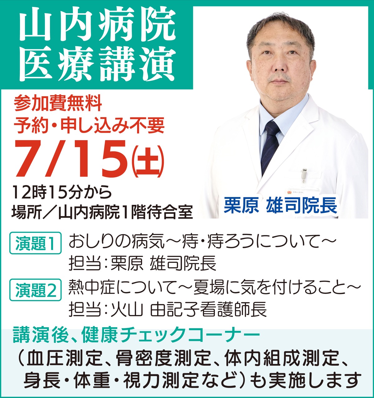 市民向け医療講演も再開。7月15日(土)のテーマは「おしりの病気」「熱中症について」。参加費無料。詳細は上図参照。