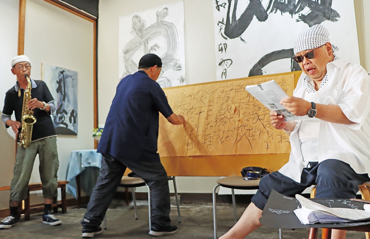 前衛書道家の井上有一に影響を受けた芸術家たちが集うイベントで、朗読は和田敏明さん、書は橋本泰司さん、アルトサックスは金子健治さんが披露した。