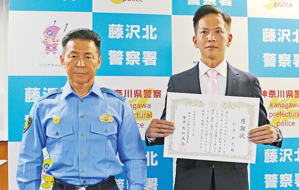 藤沢北警察署(板垣武志署長)は22日、痴漢の容疑者確保に協力したとして、いすゞ自動車藤沢工場・従業員の松本和也さん(35)に感謝状を贈った。