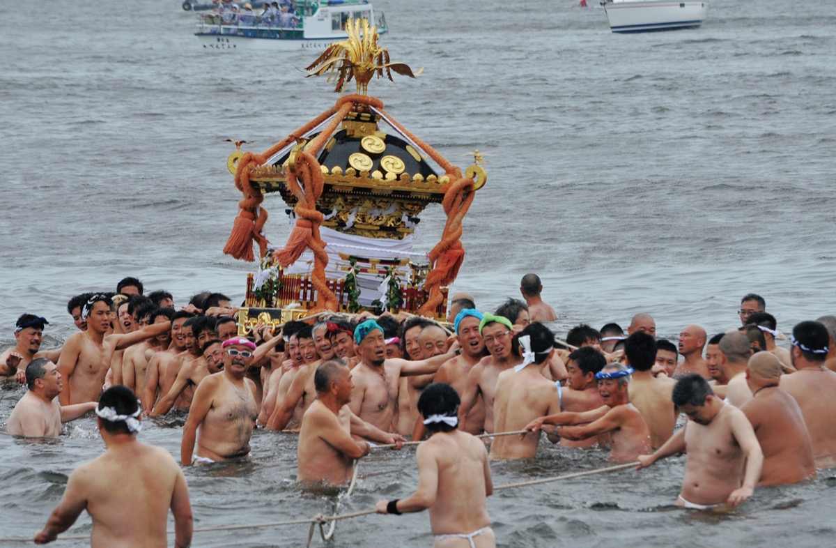 「かながわの祭50選」の一つで藤沢市重要無形民俗文化財に指定される「江の島天王祭」がこのほど行われ、9日、神輿(みこし)が海を練り歩く海上渡御があった。新型コロナ禍の影響で、2019年以来4年ぶりの開催。