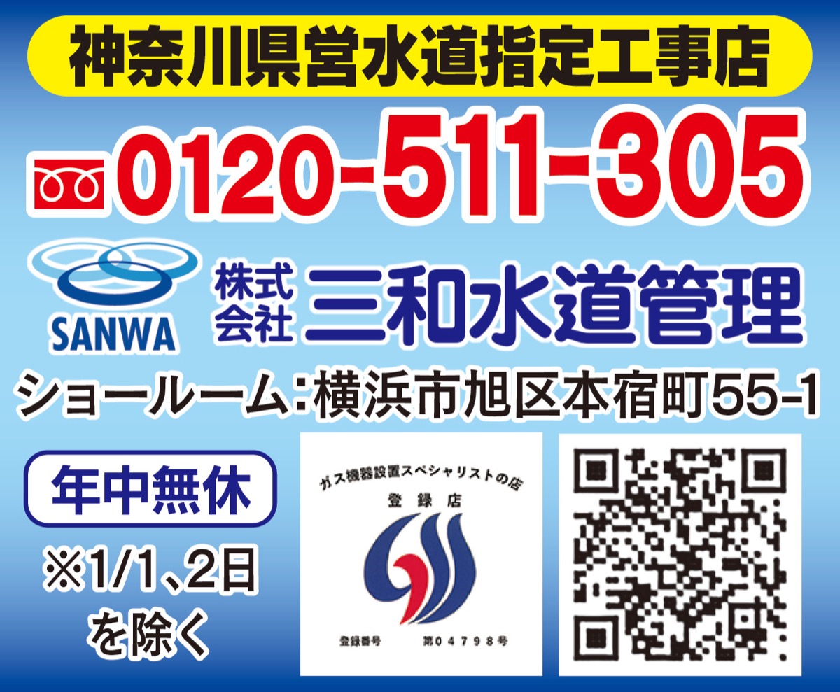 『(株)三和水道管理』は、神奈川・東京を中心に累計6万件超の施工実績を誇る水廻りのプロ。掃除がしやすい上、節水もできる最新トイレ「ピュアレストQR」やノーリツガスふろ給湯器などの住宅設備を特価で販売中。「昨年のお客様アンケート回答3305件のうち、97・7%のお客様に『満足』とご回答頂けました。これからも皆様の信頼にお応えして参ります」と同社担当者。