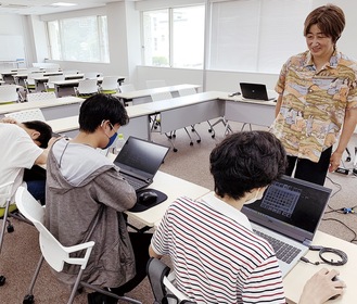 7日、藤沢市役所分庁舎の活動室。3Dブロックで構成された仮想空間でものづくりや冒険が楽しめるゲーム「マインクラフト」をプレーをしながら、子どもらが談笑を交わした。