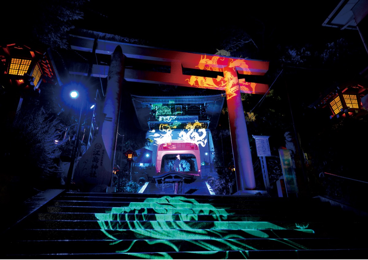 灯籠は江の島誕生の由来が描かれる「江島縁起絵巻」をモチーフにした大小千基を用意。江島神社瑞心門から辺津宮では、空間デザイン集団「VELVETA DESIGN」が手掛けた"光の絵巻"をライトアップする。今年は新たなデザインとして「新緑の江島神社」「縁日」「縁結びを願う花」などが加わり、内容を充実させた。
