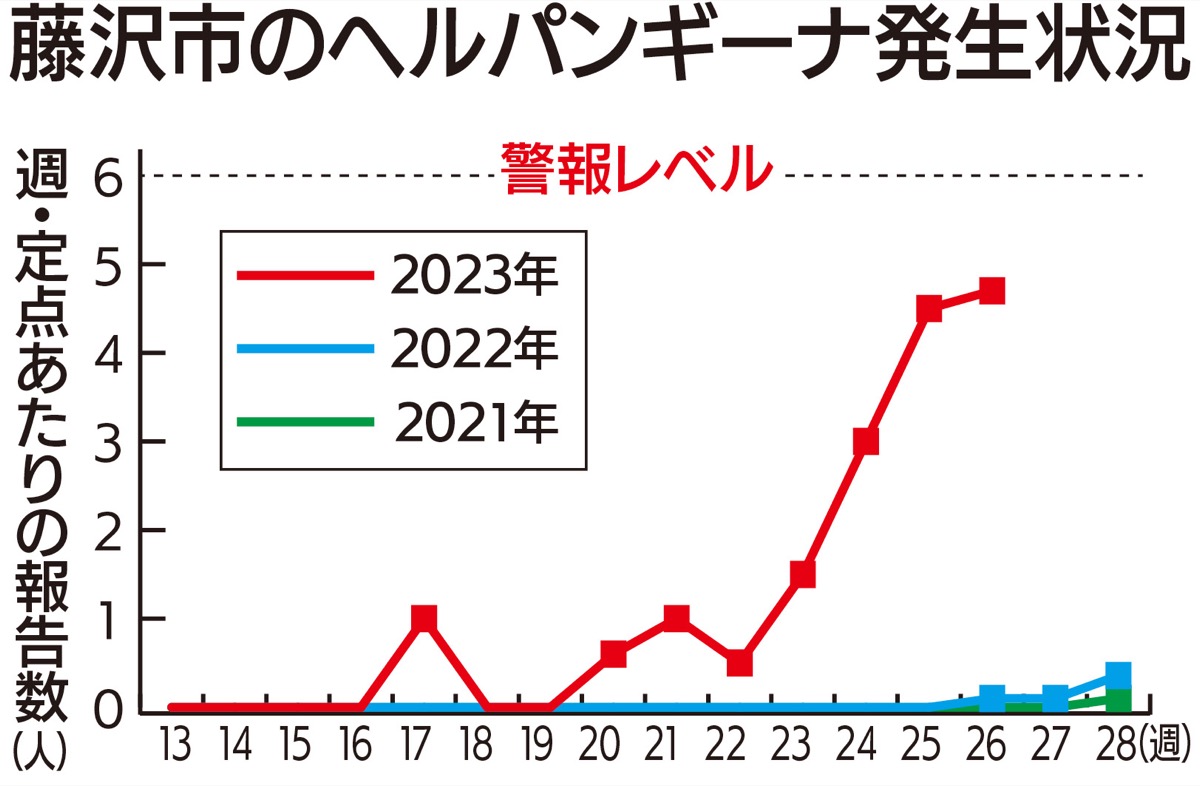 高い熱やのどの奥に痛む水ぶくれ様の発疹があらわれる病気で、夏に流行がみられる。小児科定点として定められた医療機関からの報告で毎週件数を集計しており、藤沢市では10カ所の定点で集計を行っている。