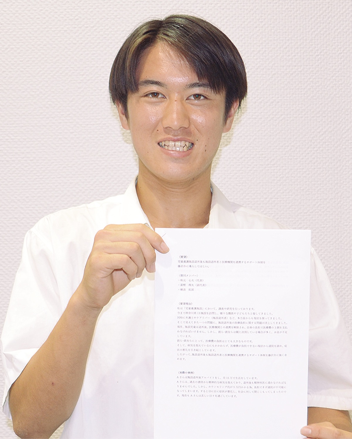 秋元さんが同級生2人とともに作成した要望書では、児童が退所後、医療機関との連携が解除されることで自身の負担で医療費を支払う現状に触れ「医療費が負担できない現状から通院をあきらめる例もある」と指摘。経済的支援などサポート体制の充実を要望した。