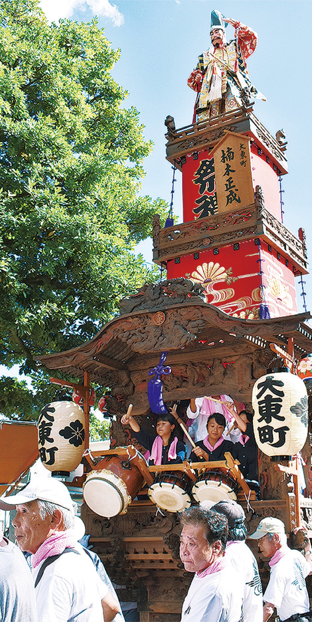 「那須与一」「源義経」「浦島太郎」など、歴史や伝承にちなんだ高さ8mにもなる人形山車=写真=9基が揃い踏み。明治中期に九つの氏子会が製作したもので、藤沢市重要有形民俗文化財も指定されている。屋台にも精巧な彫刻が施された山車が参進する様子は圧巻で、「県下で最も盛観を誇る」(同神社)という。