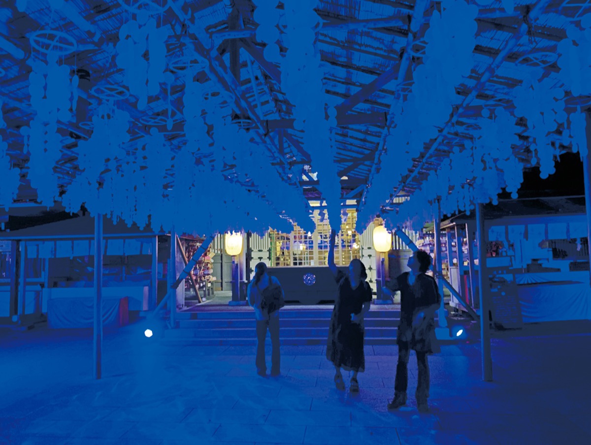 瑞心門をくぐり抜けて石段を上がると、白い貝殻で出来た風鈴の数々が来場者を迎える。貝は土産物などに使われる「カピス貝」という種類で、風が吹くとシャラシャラと涼やかな音を響かせる。周囲は夜になると青いライトで照らされ、拝殿のたたずまいと相まって幻想的な雰囲気に。訪れていた20代のカップルはスマートフォンを傾けながら「涼し気でいいね」と話していた。