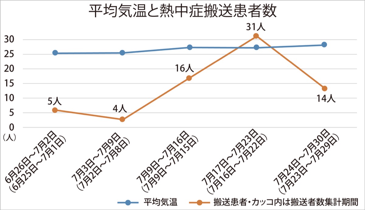 気象庁が観測している辻堂地点の平均気温でみると、搬送者数が少ない6月26日〜7月2日、3日〜9日の平均気温はそれぞれ25・5度、25・6度だったのに対し、搬送者数が跳ね上がる9日〜16日、17日〜23日の平均気温は27・4度、27・3度と、およそ2度弱上がっている。24日〜30日は、さらに上がり28・4度まで上昇した。