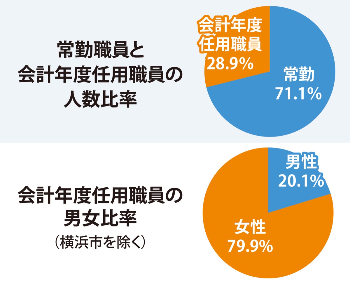 男女比率(集計が無い横浜市を除く)は、常勤職員が男性58・7%、女性41・3%で、大きな差はないが、非正規職員は女性割合が79・9%で男性の約4倍に上ることが分かった。