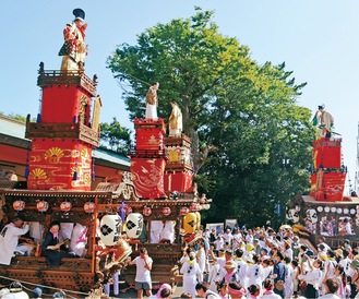 沼神明=で17日、4年ぶりに例大祭が行われた。高さ約8mにもなる9基の人形山車を一目見ようと約4500人の来場があった。