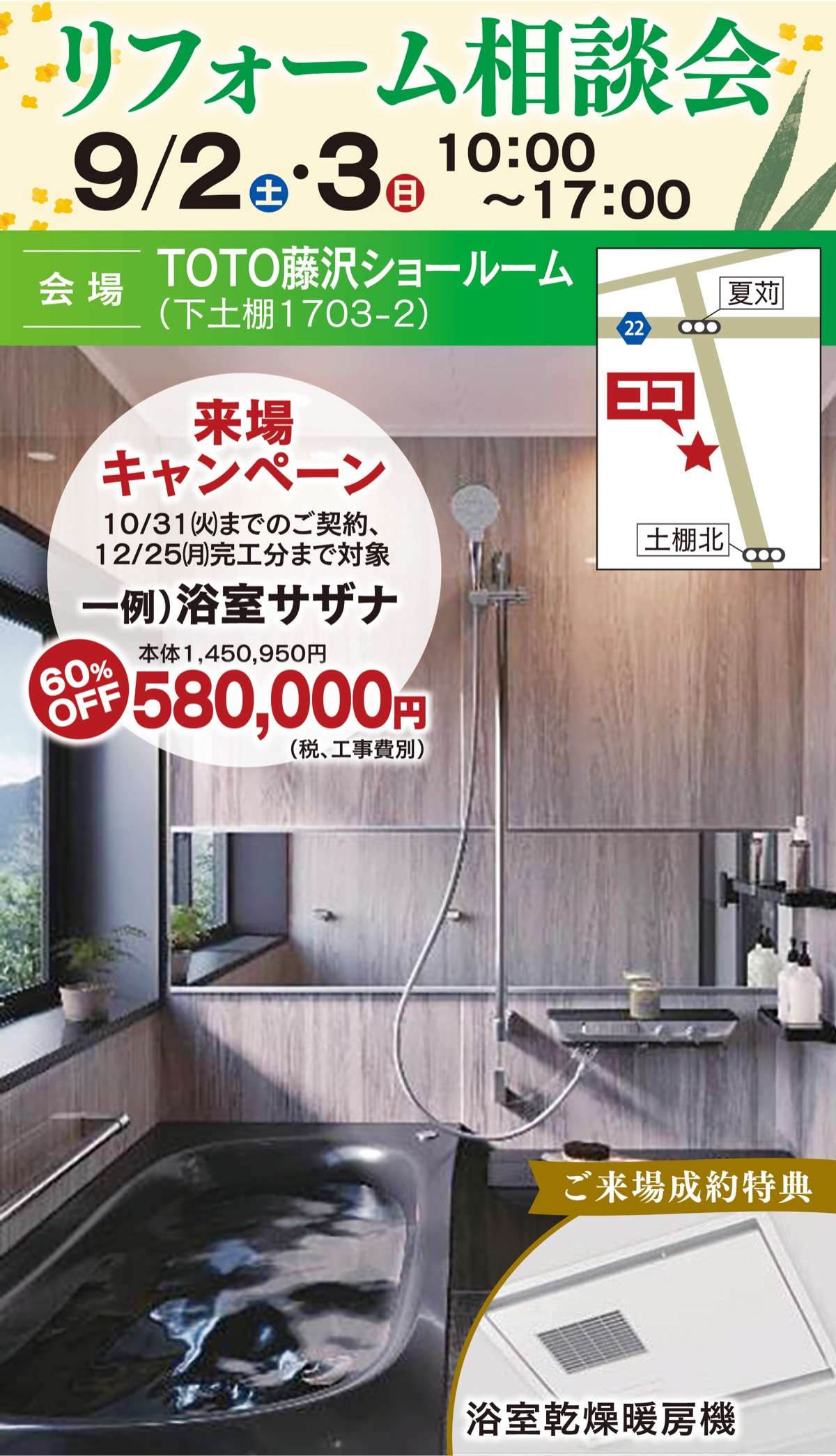 「古くなってきた水回りが気になる」「今年の内にリフォームしたい」。そんな悩みに応える「リフォーム相談会」が9月2日(土)、3日(日)TOTO藤沢ショールームで開かれる。午前10時から午後5時。入場無料。
