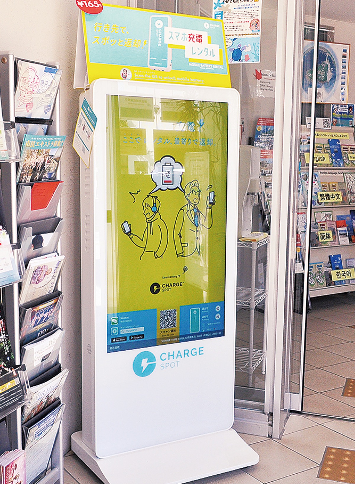 都内の(株)INFORICH(インフォリッチ)が運営するモバイルバッテリーシェアリング「ChargeSPOT(チャージスポット)」のスタンドで、機体の二次元コードから手続きでき、差し込まれているモバイルバッテリーをレンタルしてスマートフォンやタブレットなどを充電できる。バッテリーは持ち運びも可能で、他のスタンドでの返却も可。利用料金は時間によって加算される。