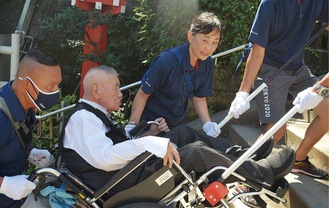 この日も専用の補助装置を使い、階段や坂道の通行をサポート。新婦の父・志村成松さんをボランティア4人が息を合わせて支え、「強力が通ります」と声をあげながらタクシー乗り場と中津宮を往復した。