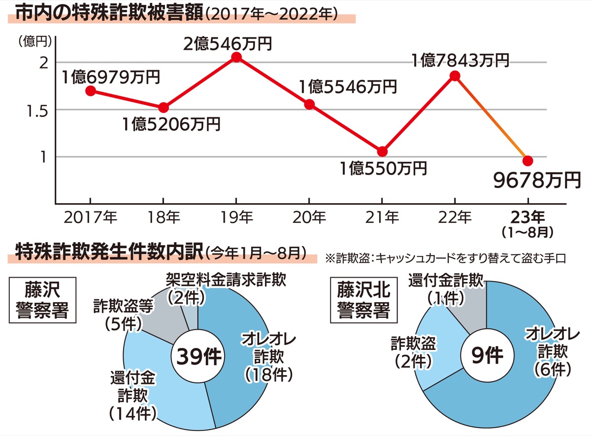 藤沢市内における今年1〜8月までの特殊詐欺の認知件数は48件で、被害総額は9678万円にのぼることがこのほど本紙の調べで分かった。