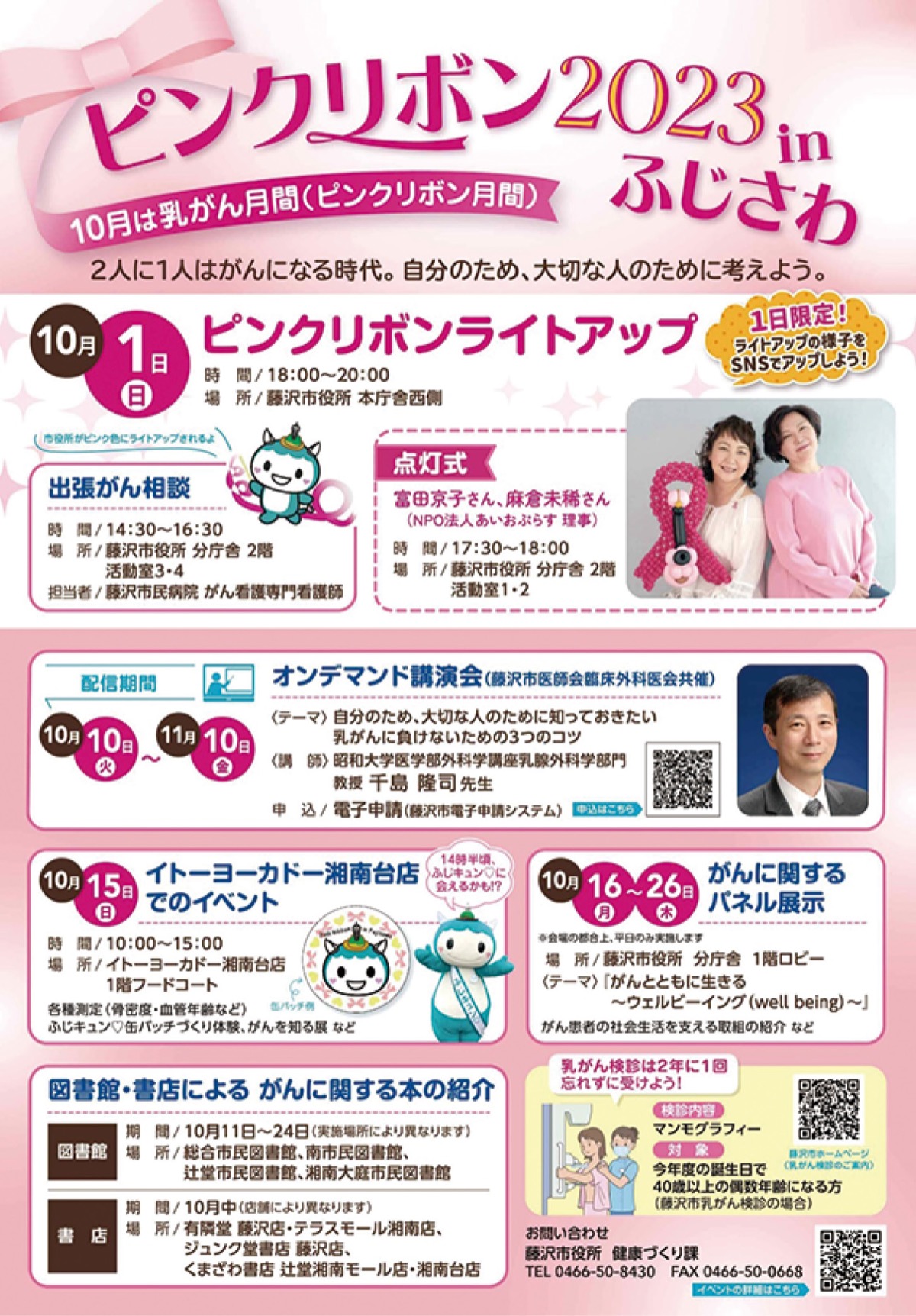 乳がんの早期発見・治療の大切さを啓発する「ピンクリボン2023inふじさわ」が10月1日(日)から始まる。藤沢市役所のライトアップや、がん相談、オンデマンド講演会などが行われる。