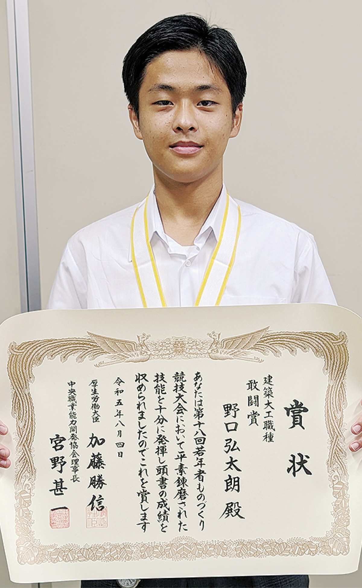 表彰に訪れた県職業能力開発協会技能検定部長の木下公太郎さんは「専門的に学ぶ年上の人たちと、堂々と渡り合っていた」と賛辞を贈った。
