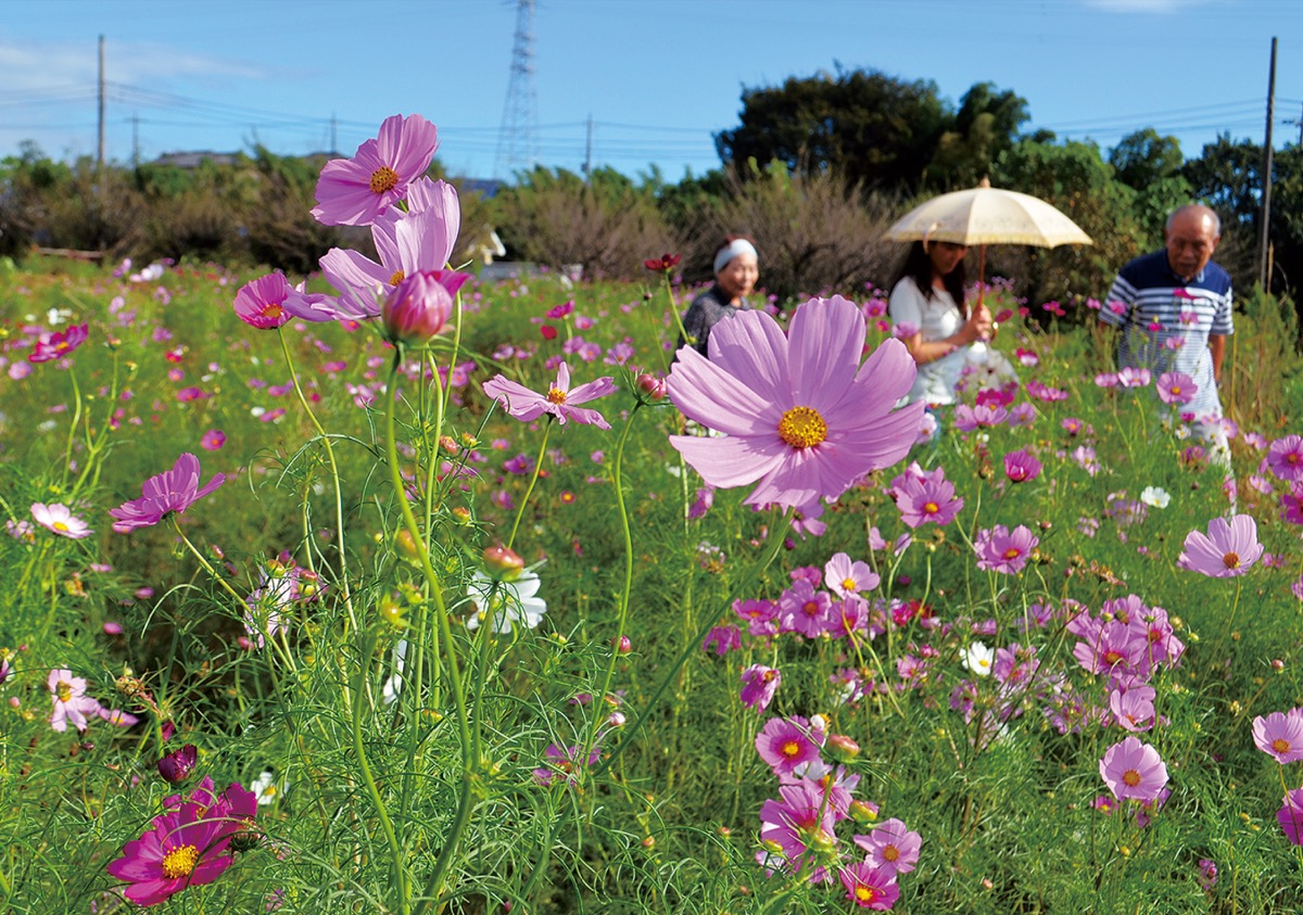 遠藤のコスモス畑が見頃を迎え、ピンクや白色の花が、散歩に訪れる近隣住民の目を楽しませている。