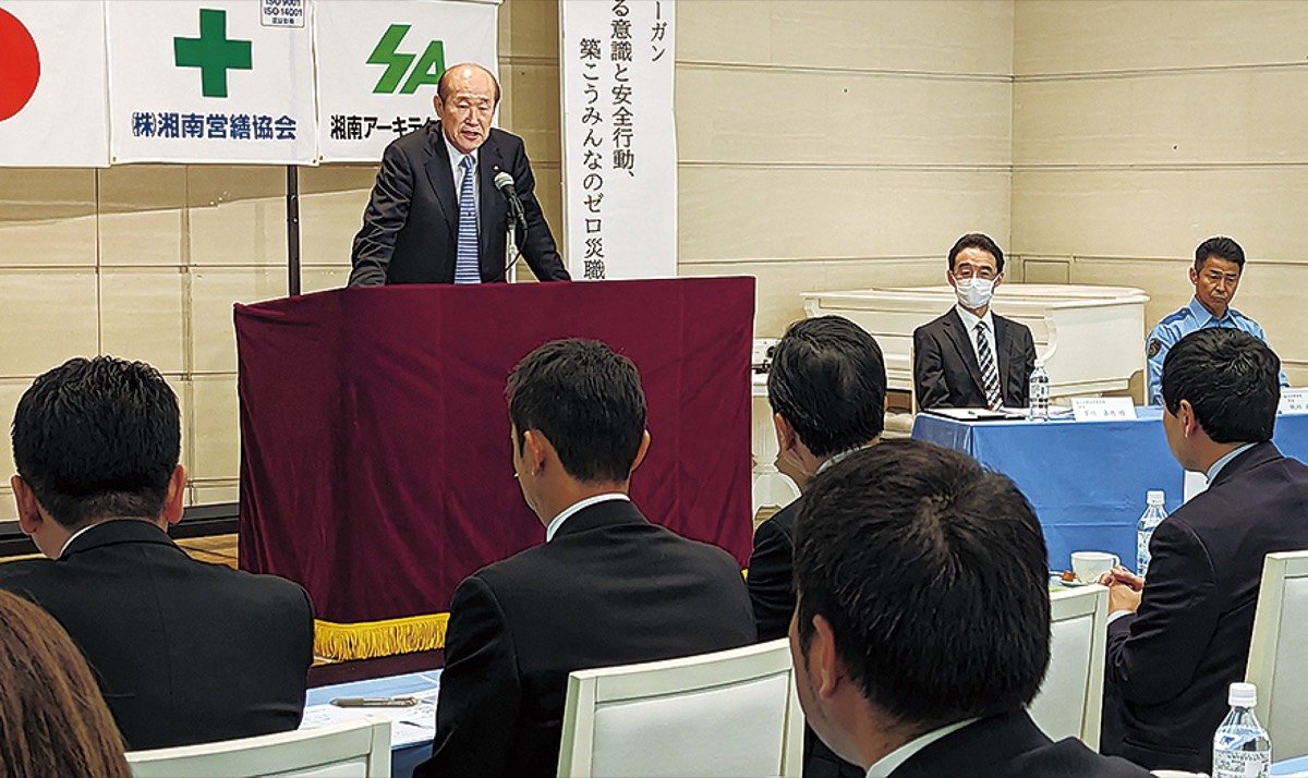 建設業の(株)湘南営繕協会(最上重夫社長)と湘南アーキテクチュア(株)(清水恵子社長)主催の「合同安全大会」が13日、湘南鎌倉クリスタルホテルで開催された。協力業者やメーカー、関係者ら約120社が参加、事故ゼロを誓い合った。