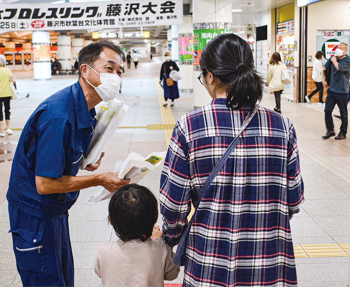 近年多発している特殊詐欺の手口や、異常に安い金額で契約を結びトラブルにつながる悪徳なガス事業者の手口などを紹介するパンフレットなどが入った啓発グッズを200セット用意。湘南台駅改札前を通る人に手渡しながら、「特殊詐欺や悪徳業者にご注意ください」と呼びかけた。