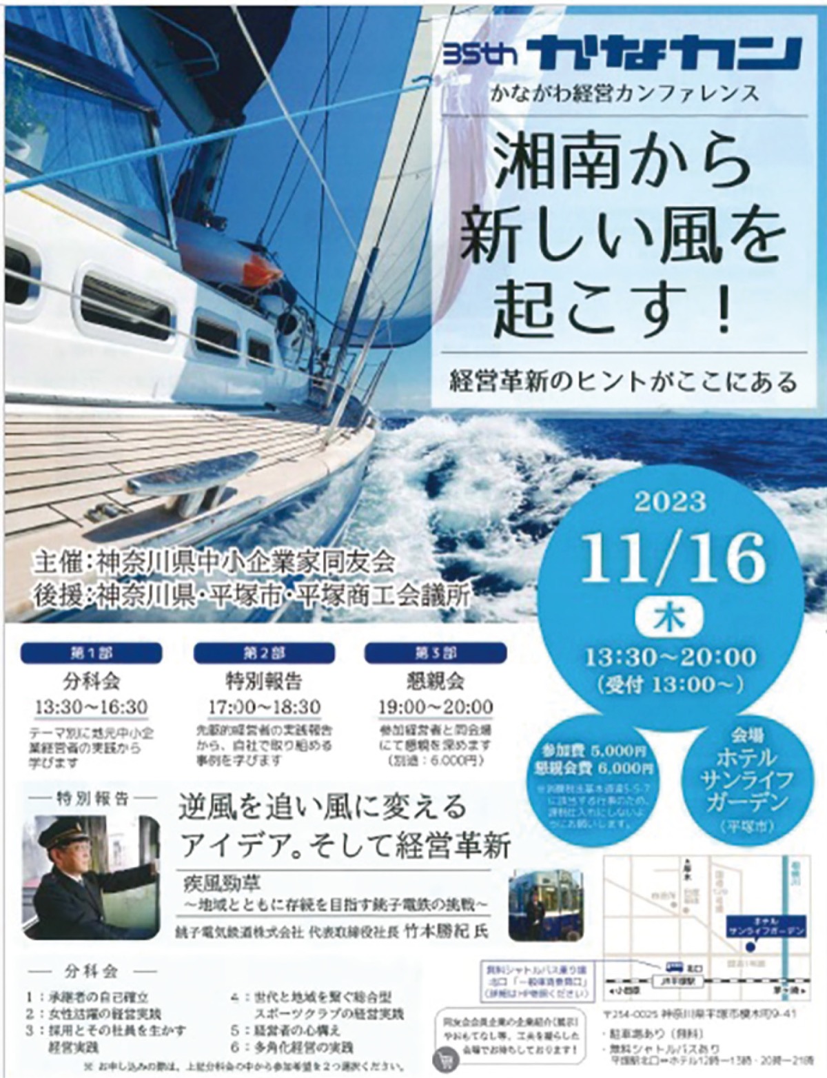 「湘南から新しい風を起こす!経営革新のヒントがここにある」と謳った今イベント。当日、メインとなる特別報告では、アイデア溢れる副業で経営危機を乗り越えた銚子鉄道の社長、竹本勝紀氏を迎え「地域とともに存続を目指す銚子電鉄の挑戦」と題した講演が聞ける。