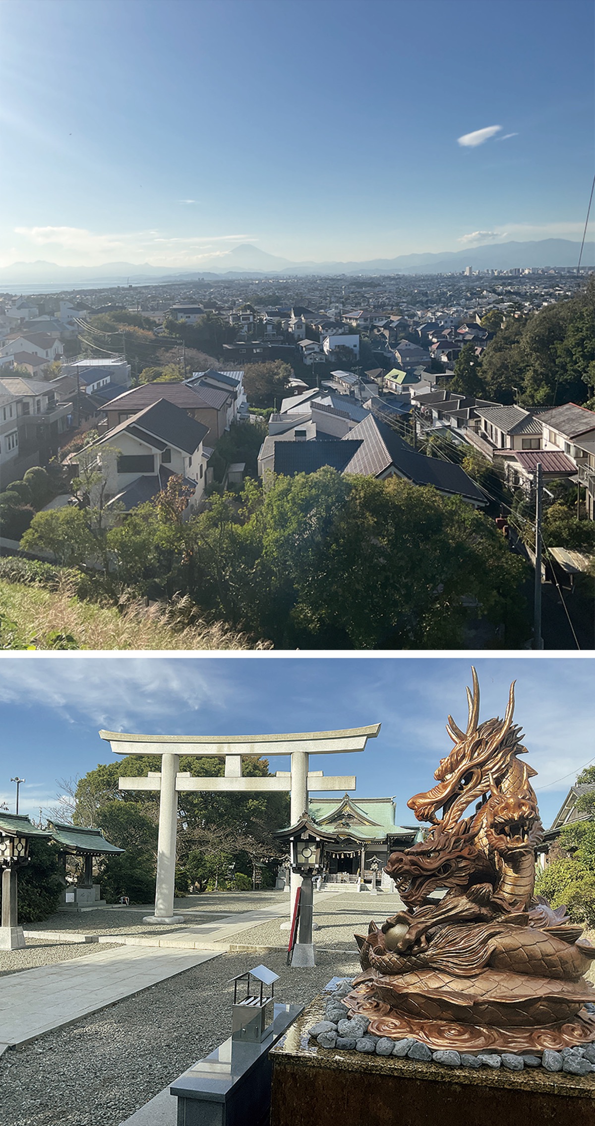 五頭龍を祭神とする神社で、鎌倉市腰越にある龍口明神社は、元は龍口寺の隣にあった。現在の地は龍の胴にあたるとされる。権禰宜・岡田匡大さんは「どの山が五つの頭なのかはわからないが、小さな頃からこの辺りの地形を龍に見立てていた」と話す。
