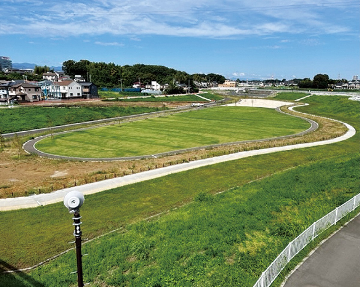 下土棚遊水地は、面積約14 ha、約46万㎥の洪水を貯めることが可能で、引地川流域での浸水面積を約25 ha減少する効果があります。治水施設としてはすでに供用が始まっており、現在は、上部利用のための整備が行われております。