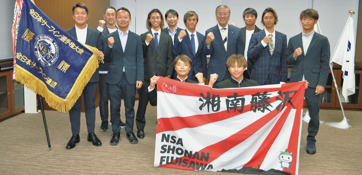 日本サーフィン連盟湘南藤沢支部(田村隆之支部長)が先月30日、藤沢市役所を訪問し「第57回全日本サーフィン選手権大会」での団体優勝や各種目での優勝を鈴木恒夫市長に報告した=写真。
