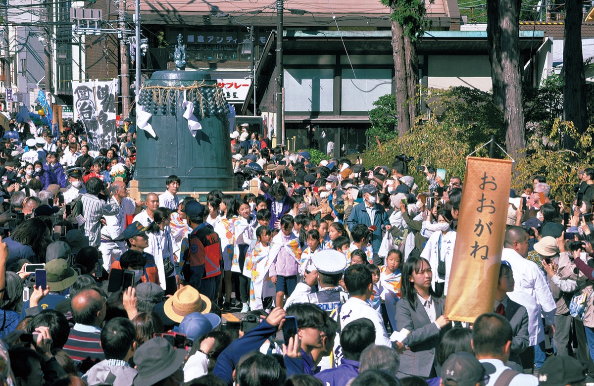 鎌倉市山ノ内で先月29日、60年に1度の「洪鐘祭(おおがねまつり)」が開催された。新型コロナの影響で延期となり、3年越しに実現。触れ太鼓を先頭に神輿や囃子が続き約300mの行列が練り歩いた=写真。