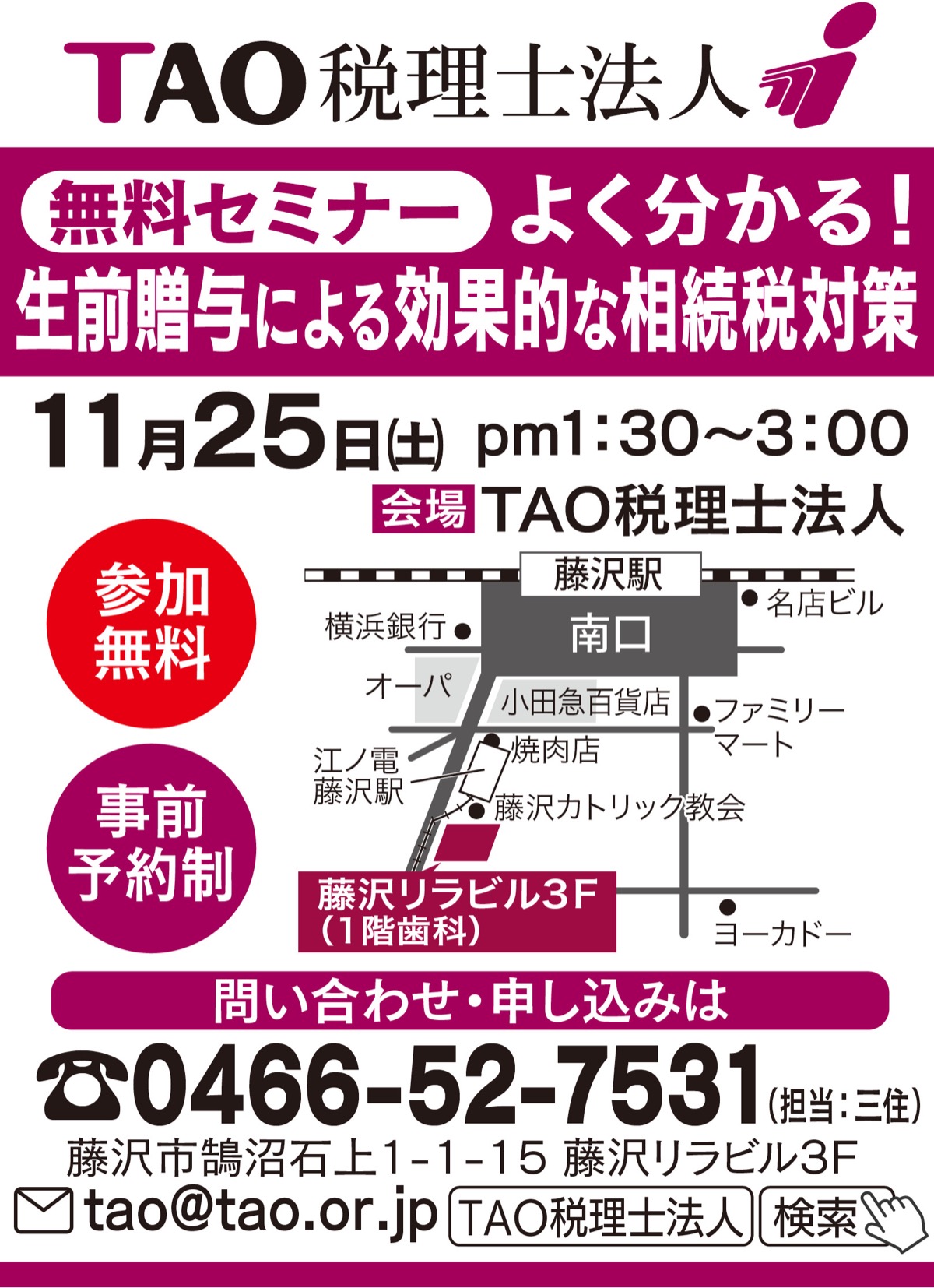 昨年末の税制改正で見直しになった相続税・贈与税について学ぶ無料セミナーが11月25日(土)、藤沢駅南口徒歩3分のTAO税理士法人で開かれる。「よくわかる!生前贈与による効果的な相続税対策」と題し、税理士が新制度を踏まえた対策について解説する。午後1時30分から3時。