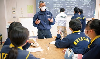 中学生に仕事の楽しさや意義を知ってもらおうと六会中学校で2日、2年生対象の体験型職業講話が行われ、生徒が地元企業の話に耳を傾け体験プログラムを行った。